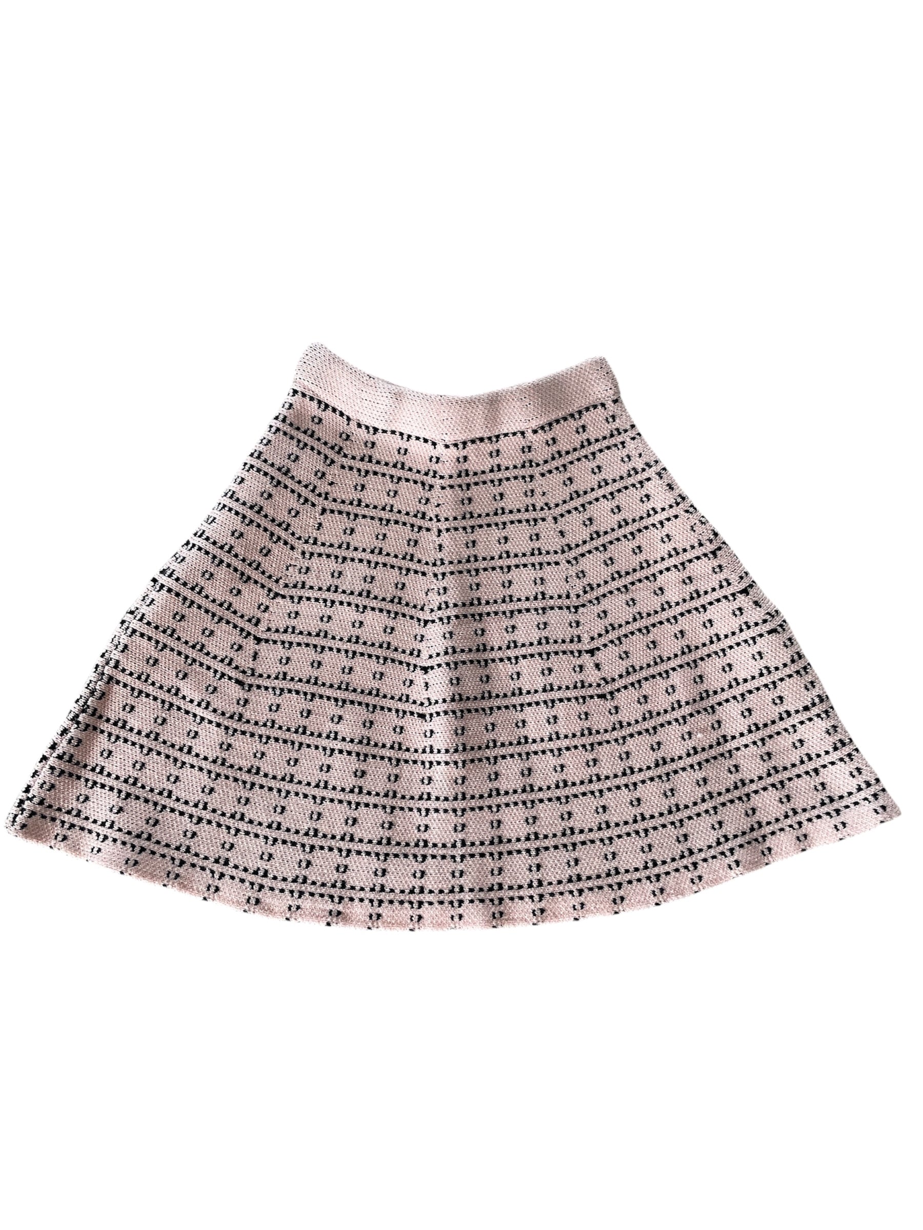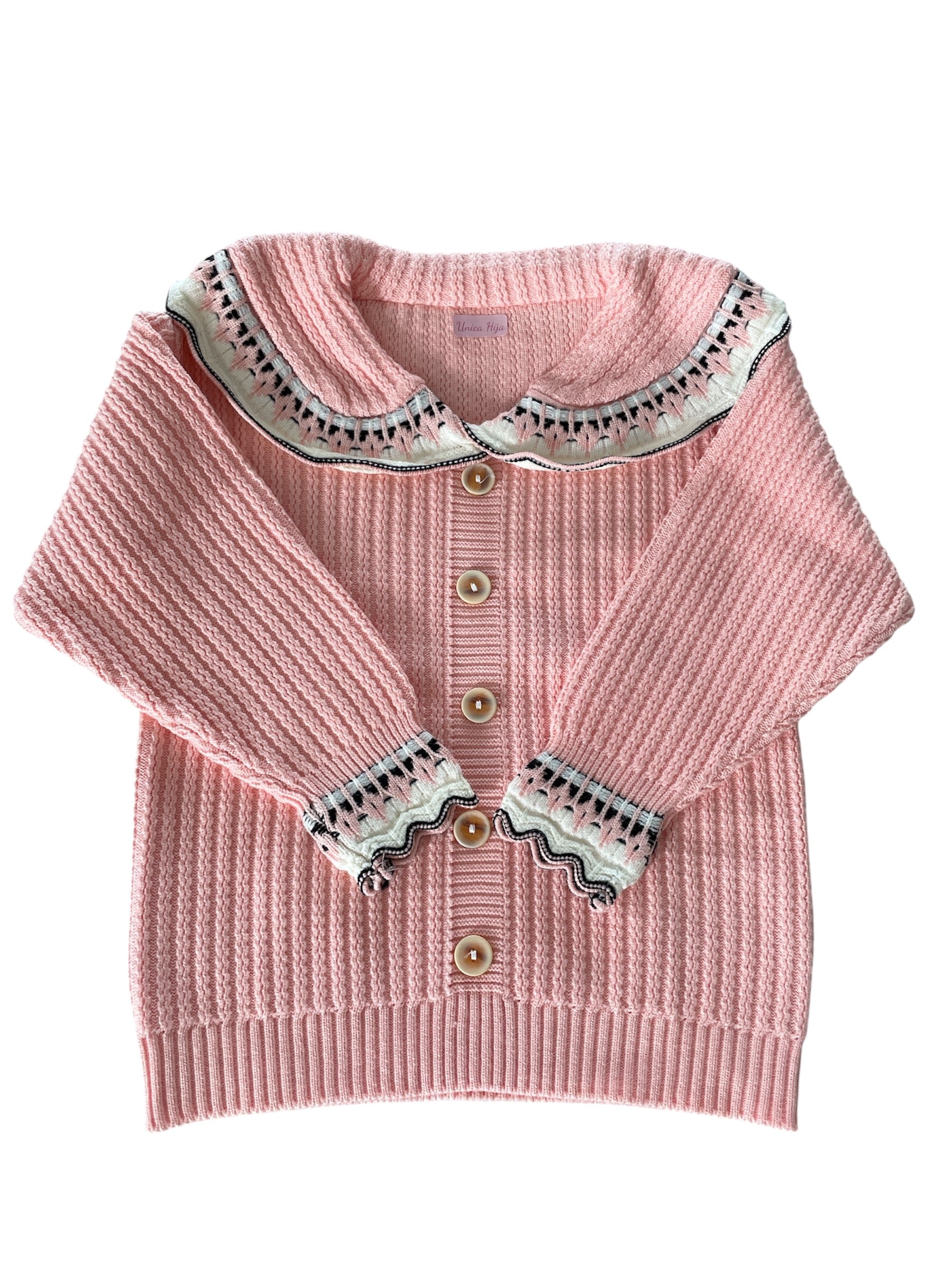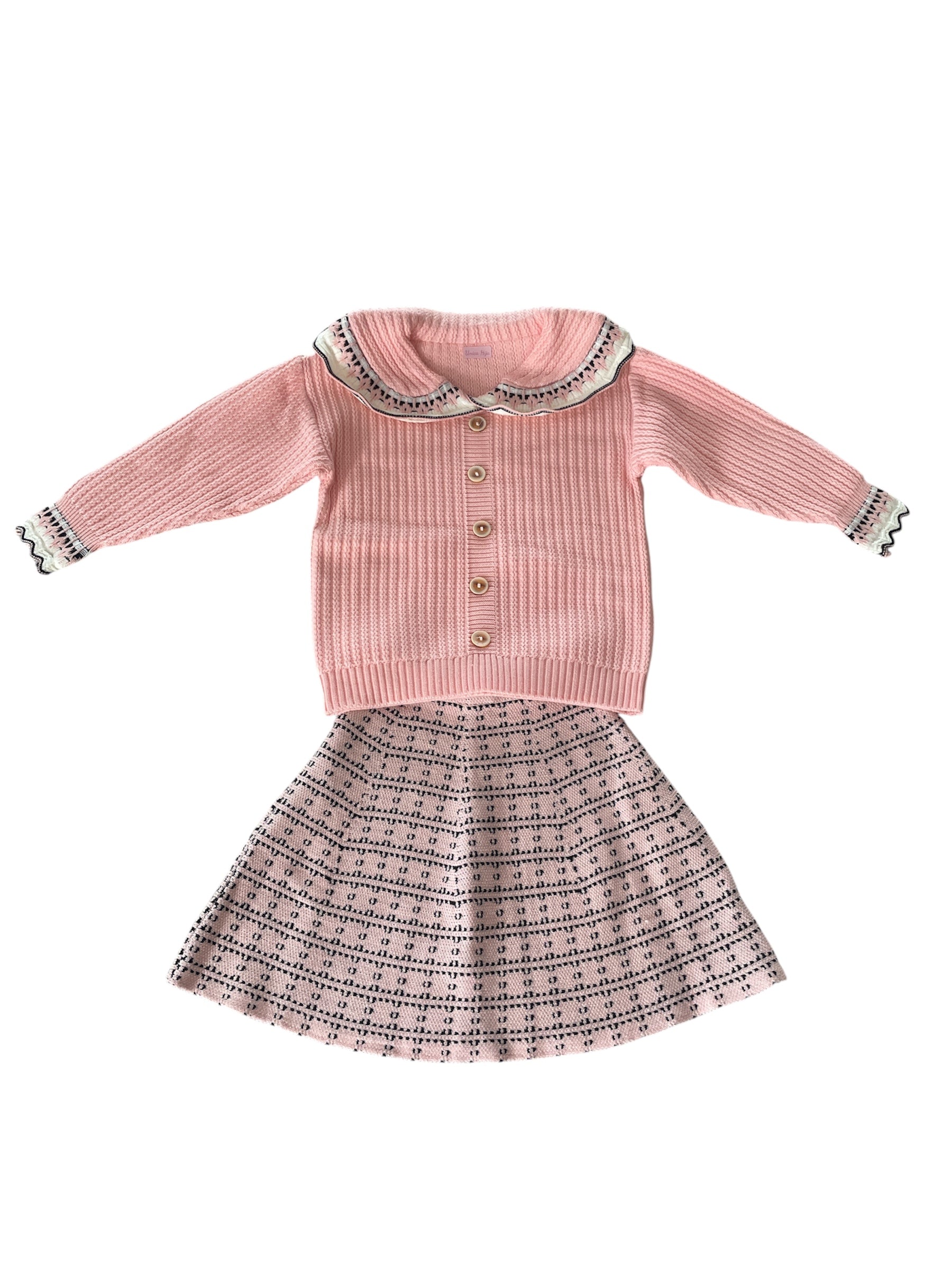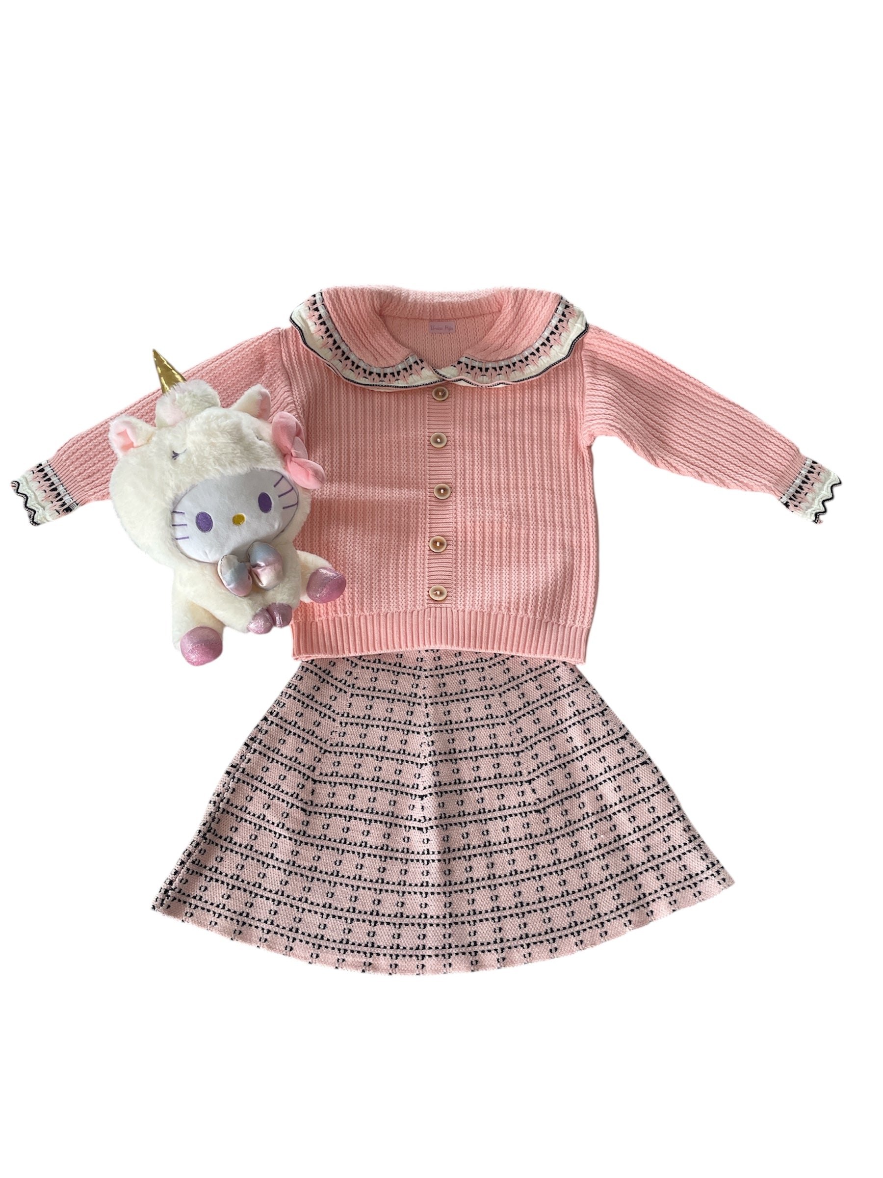 Pink Parisian Knit Set is perfect for your little fashionista. This two-piece ensemble features a beautifully ribbed, button-down knit sweater in soft blush pink with scalloped detailing on the cuffs and collar, adding a touch of classic flair. Paired with a matching A-line knit skirt adorned with delicate black patterns, this outfit strikes the perfect balance between playful and polished.