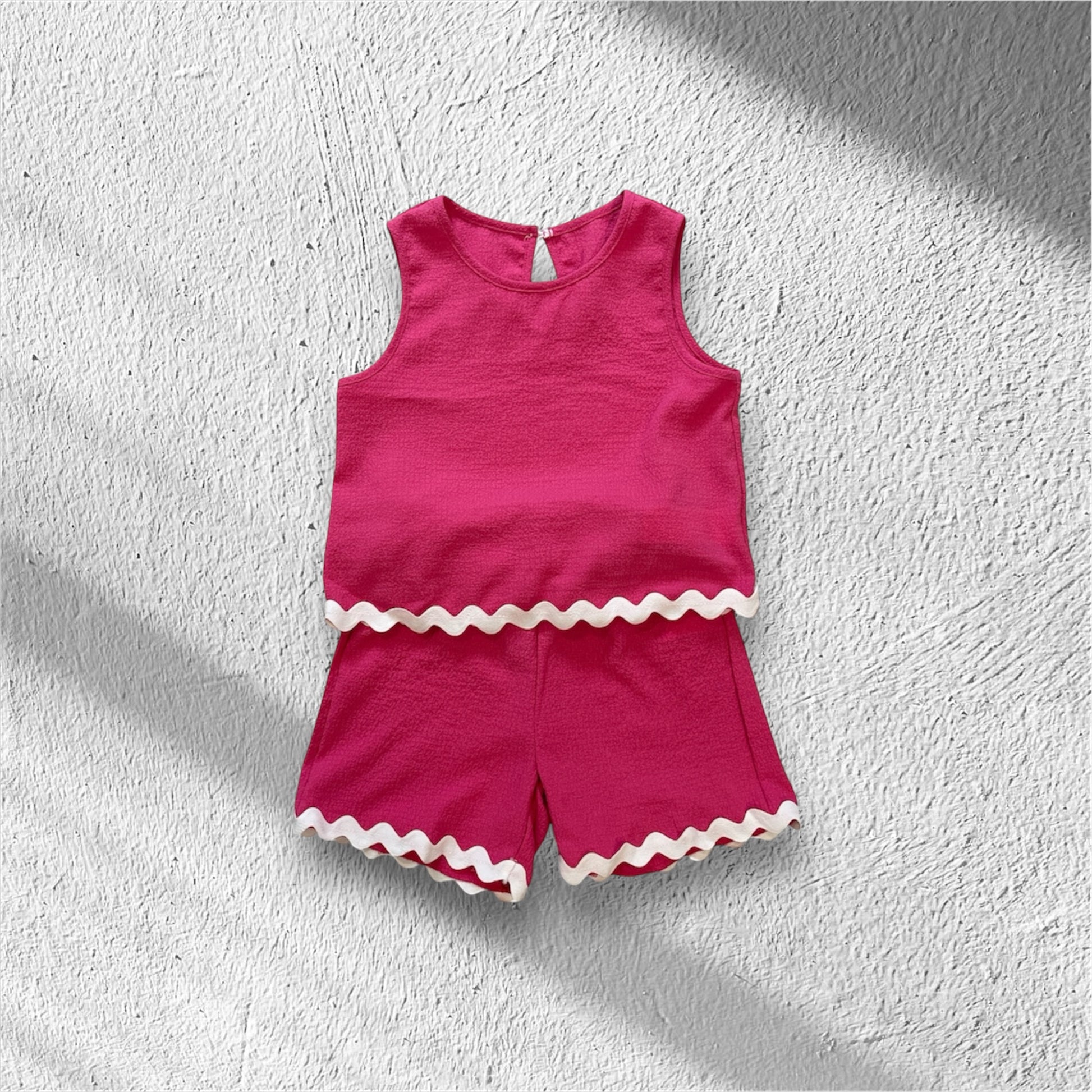 Featuring a vibrant pink sleeveless top and matching shorts with playful white wave trim detailing, this set is designed for comfort and charm. Made from soft, breathable fabric, itโs ideal for playdates, holidays, or casual days out. ๐