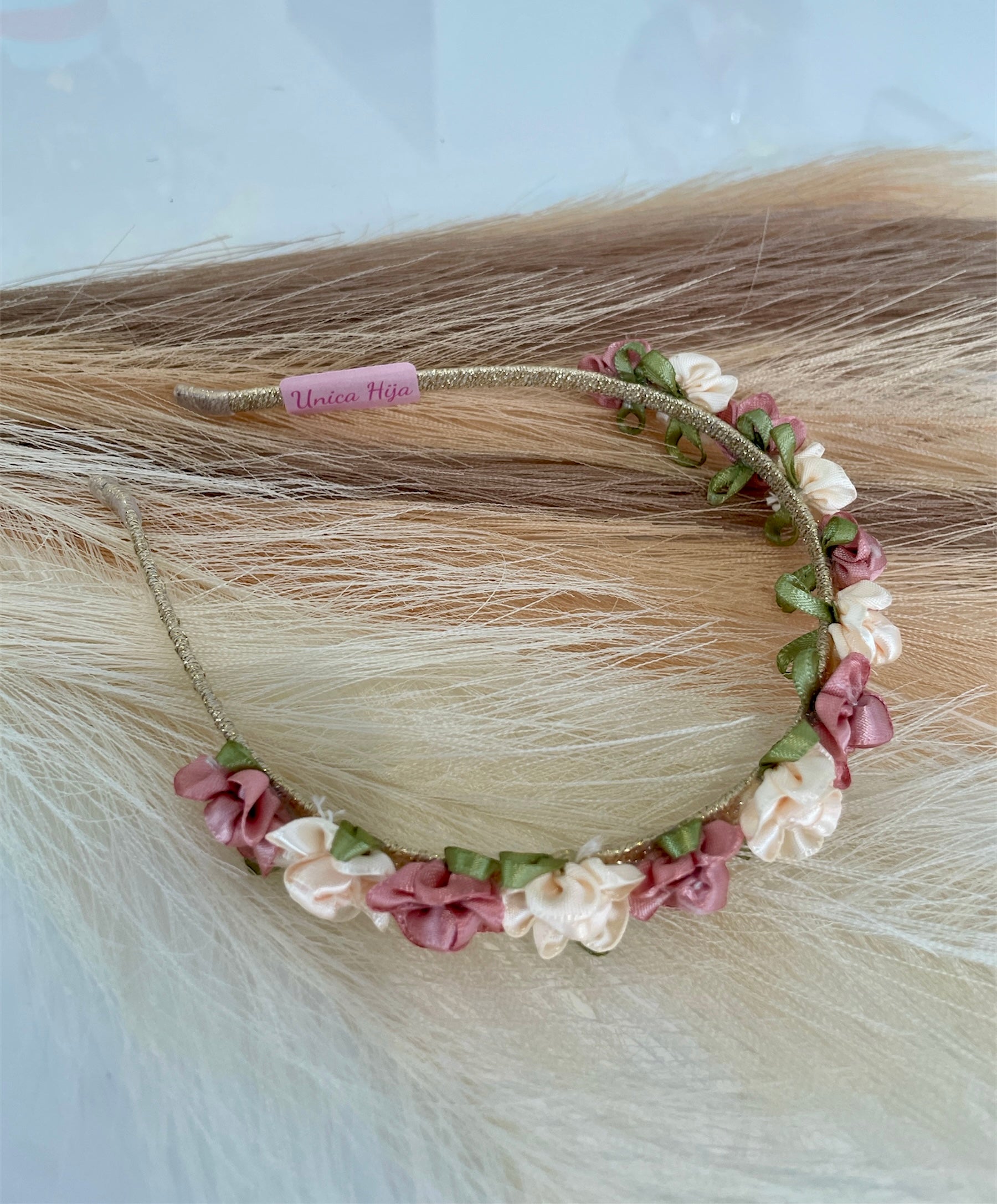 Let your little one bloom in the Rose Garden Crown — a beautifully handcrafted headband adorned with delicate rose-pink and ivory florals, accented with tiny green ribbon leaves on a soft gold band.