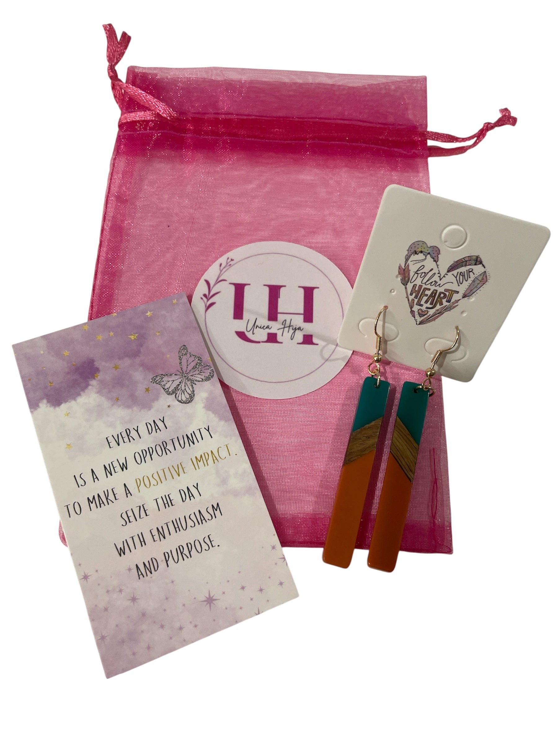 Bring bold color and effortless style to your look with these statement resin bar earrings. Featuring a striking blend of teal, warm orange, and wood-like detail, they’re the perfect balance of modern and earthy charm. Lightweight and eye-catching, these earrings are ideal for brightening up your everyday outfit or adding a pop of personality to a night out. Packaged beautifully with a positive affirmation card, they make a thoughtful gift or a treat just for you. ✨